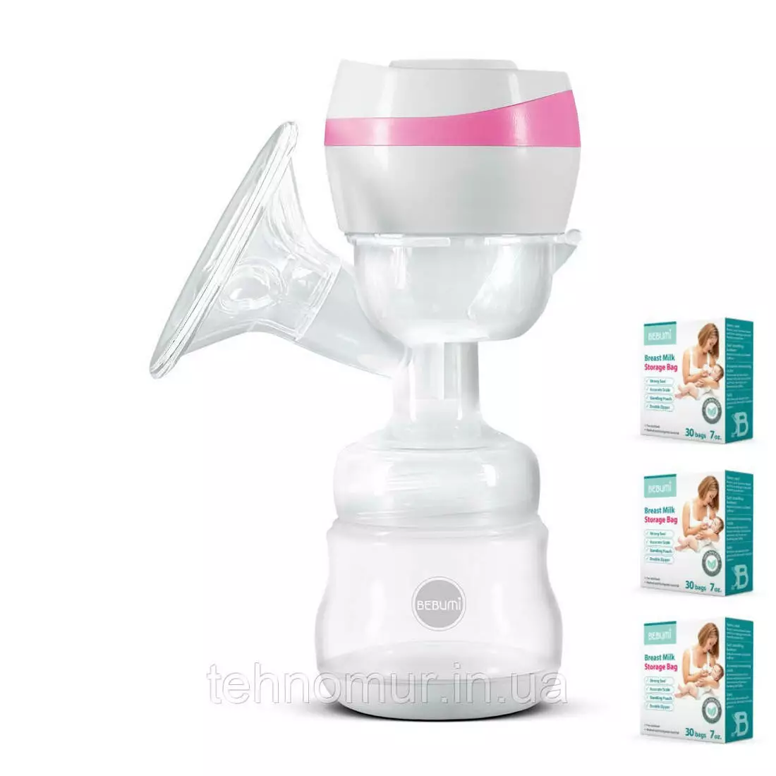 Электрический двухфазный молокоотсос Bebumi BS1 (pink) с силиконовой соской + пакеты для хранения молока