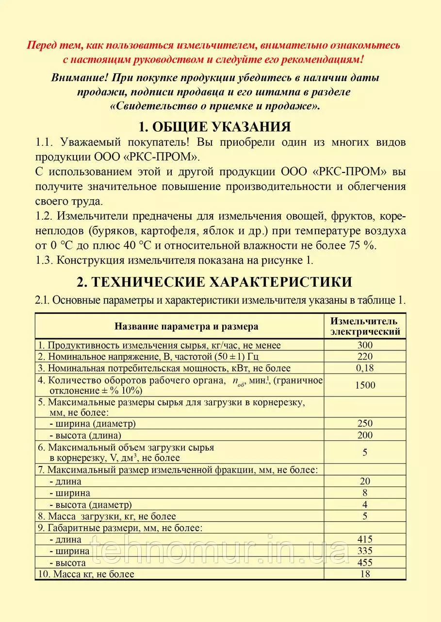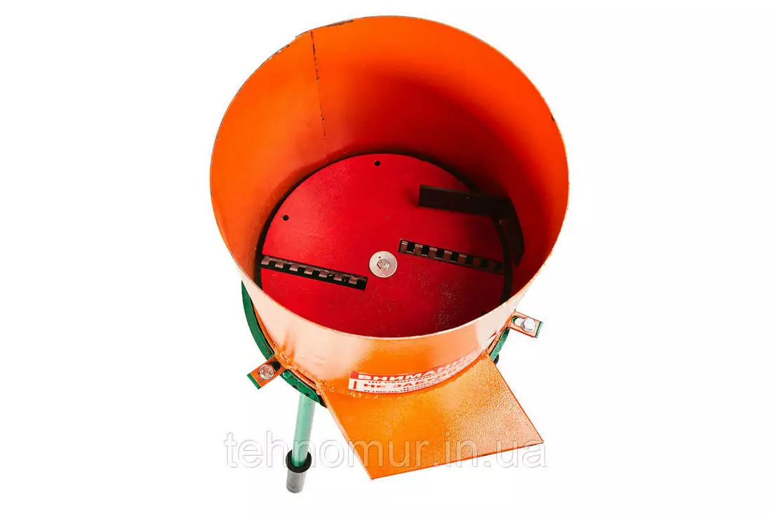 Загрузка сырья верхняя, выброс измельченного сырья происходит из специального раструба, которых находится в нижней части рабочего бункера. Все детали сделаны из нержавеющей стали. Режущий элемент овощерезки выполнен из специальной стали и ножами с острыми зубцами, которые обеспечивают равномерное нарезание продукта и качественную стружку. Овощерезка оборудована редуктором, передающие числа которого обеспечивают эффективное измельчение продукта. Продукт на выходе подходит для отжима сока на печати, приготовление фруктового варенья, изготовление домашнего вина, приготовление кормов домашним животным. Пресс для сока можно купить отдельно.