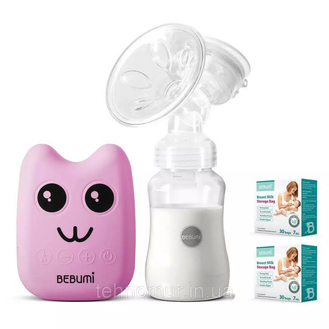 Электрический молокоотсос Bebumi BS Eco (B pink) с силиконовой соской + пакеты для хранения грудного молока