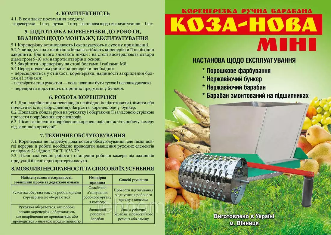 Производительность измельчения: за 60 оборотов 5 кг корнеплодов.