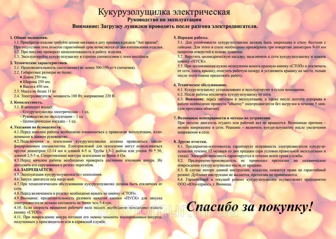 - Кукурузолущелка электрическая – 1 шт.