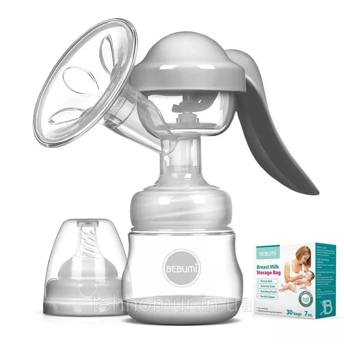 Ручной молокоотсос Bebumi BM Pro (white) + силиконовая массажная насадка + пакеты для хранения грудного молока