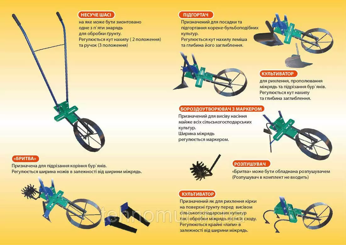 удаления сорняков, прополки, посева семян, окучивания рядов и